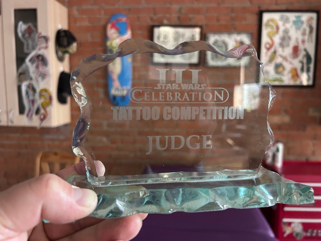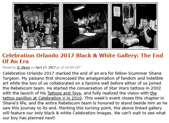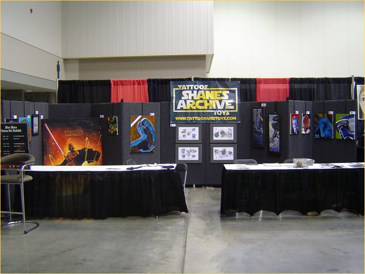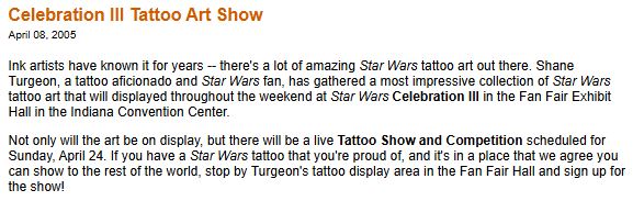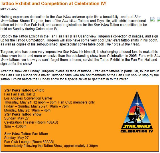 Twenty years ago, Star Wars Celebration III was a pivotal moment in the history of the event. Several traditions began that weekend that still carry over into the Celebrations of today. One of those is the Tattoo Track, or Tattoo Pavilion. Back in 2005, Star Wars tattoos were featured at Celebration for the very first time! At the helm of this was Shane Turgeon, who had been exhibiting pictures of people’s Star Wars tattoos on his website Tattoos and Toys. I had Shane on Into A Larger World podcast to get the full story of this now beloved feature of Celebration. In this post, you’ll see some of Shane’s personal photos from 2005 and some additional articles and things from the years that followed, plus links to photos and videos that we discuss in the podcast episode!