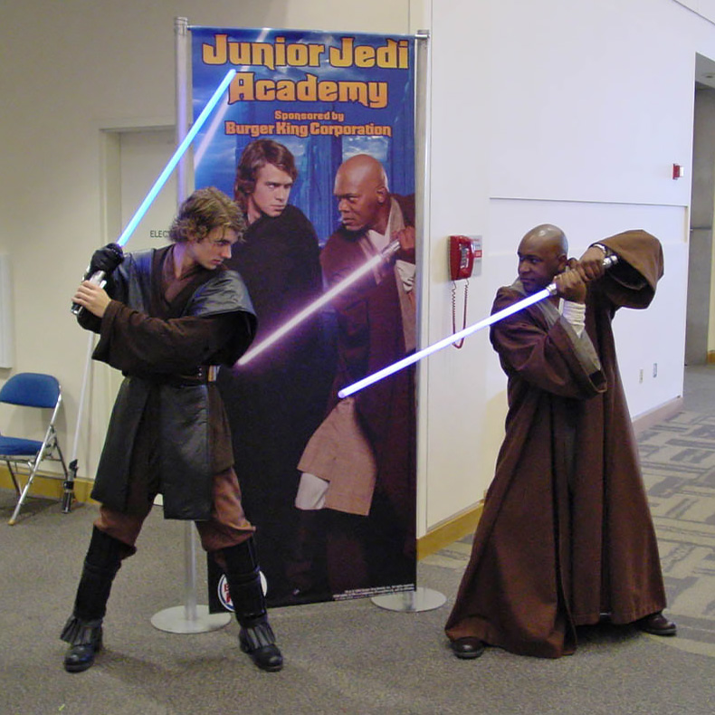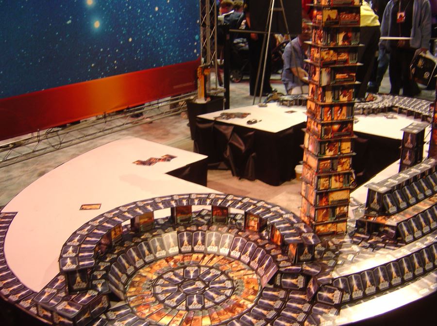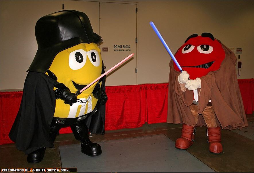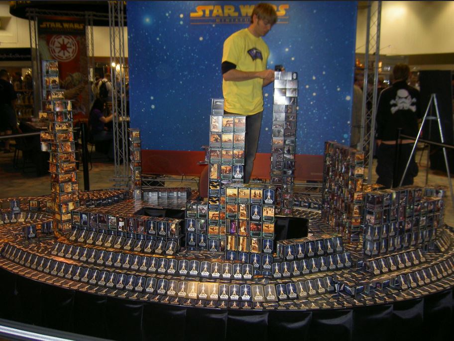 THE CARD TOWER ~ Throughout the weekend, the Star Wars TCG (Trading Card Game) booth was building a gigantic card tower. This tradition of constructing and destroying card structures seems to have continued at GenCon, which was periodically operated by Wizards of the Coast, who also ran CIII. The impressive structure was modeled to look like Cloud City and stood tall, marked off by ropes, and (as far as I know) undisturbed…until the last day of the event, when a kid dressed as Darth Vader got to ceremoniously knock the tower down with a lightsaber as the crowd cheered on. I found a video file of this moment in the Rebel Scum Celebration archives and uploaded it to my YouTube channel, click here to watch it!